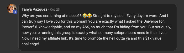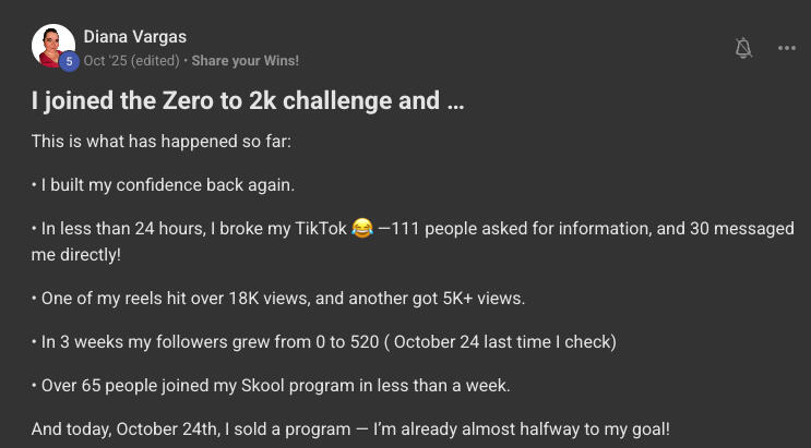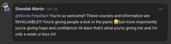 Nicole has run the Zero to $2K Challenge multiple times with the same result every time: participants generate new leads by week two, and multiple students hit their $2K goal in 30 days.Zero refunds. Ever.